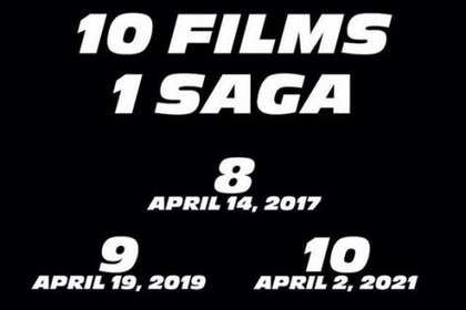 Продюсер грядущих лент серии «Форсаж», Вин Дизель опубликовал на своей странице в социальной сети изображение с указанием намеченных дат выхода следующих продолжений франшизы. kinogo.yt О том, что восьмая часть выйдет в 2017 году, ранее уже пробегала информация, но вот насчёт девятой и десятой, до сего момента сведений не было. В общем, судя по изображению, девятая часть выйдет 19 апреля 2019 года, а десятая 2 апреля 2021 года. Если вы ранее пропустили информацию насчёт восьмой, то она выйдет 14 апреля 2017.